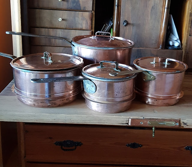 Ett gäng kopparkastruller som tillhört farmorsmor fick komma ner från vinden, putsades upp, och fick bli ytterkrukor till julblommor till våra barn. Återbruk med proveniens är allra roligast!