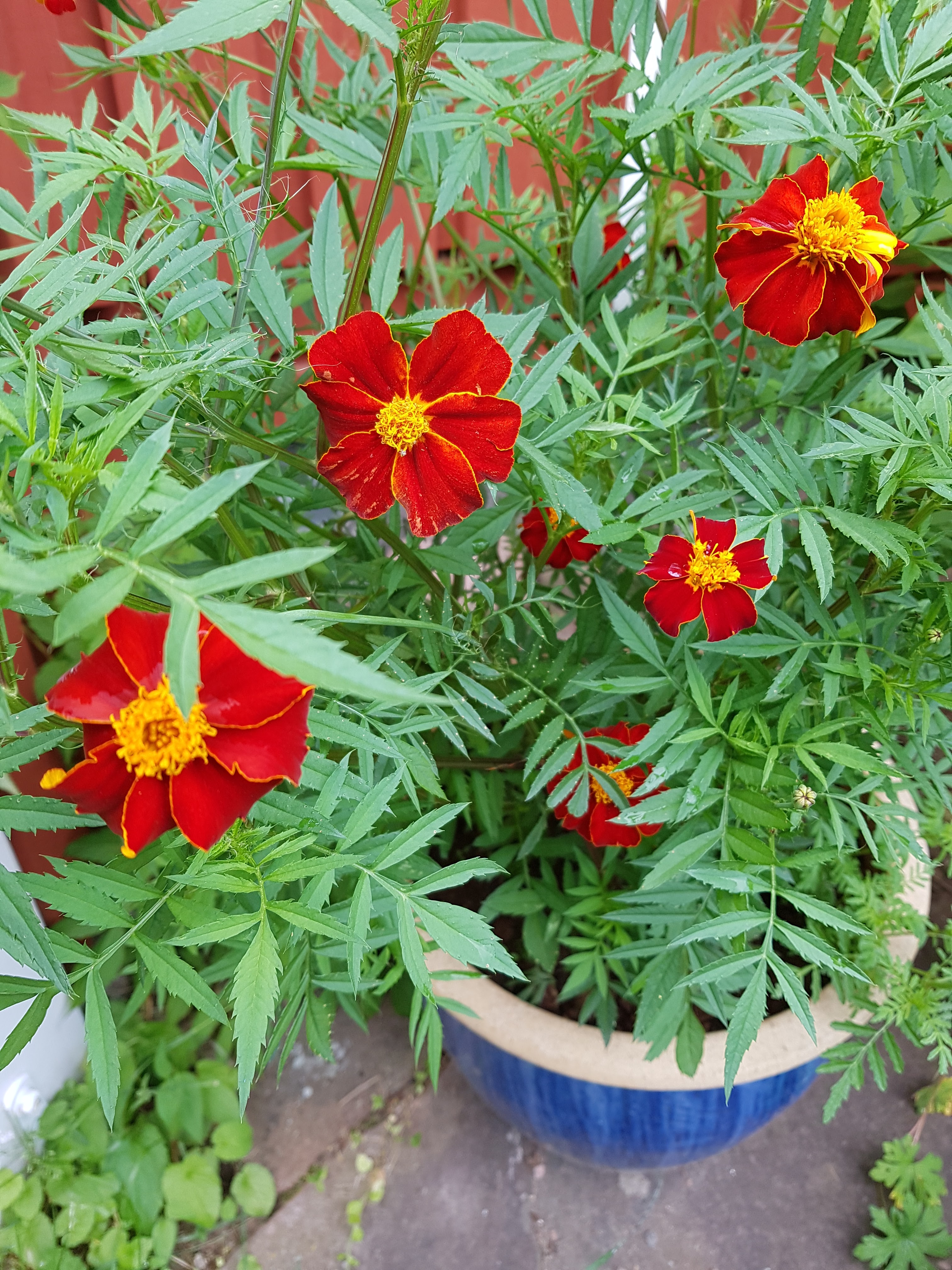 Jag fick frö av min vän B. till en gammal tagetessort som kallas lackrosor i Leksand. De är något mörkare i verkligheten. Jag tycker att de liknar Linnétagetes men vet inte säkert.